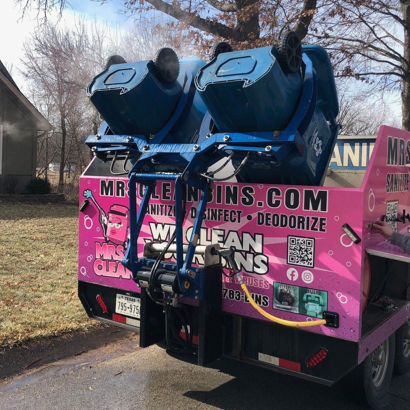 Mrs. Clean Bins gives your garbage bins a 230° Hot Pressure Wash that removes all that Cleans, Disinfects, and Deodorizes